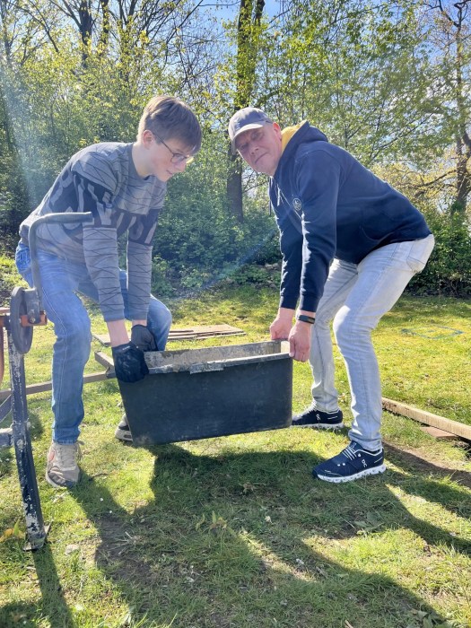 Es wurden 22 40kg-Betonestrich-Säcke angerührt, in die Löcher verbracht und akkurat verdichtet. „Das ist für die Ewigkeit“, waren sich alle einig.