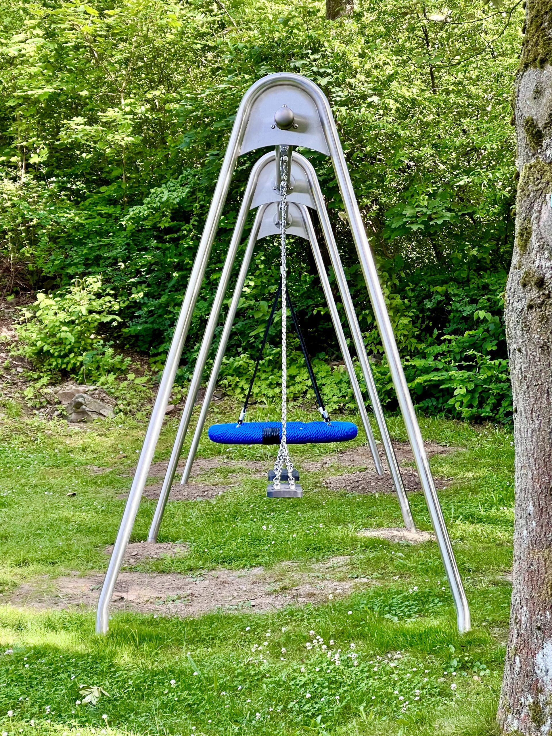 Und die Schaukel scheint den Belastungen auch standzuhalten. Immerhin 1200 kg Beton wurden für die Fundamente eingebracht. Wir sind uns alle sicher, dass das 4k € – Invest für dieses wirklich sehr gut verarbeitete Spielgerät, das komplett aus nichtrostendem Stahl gefertigt wurde, bestens angelegt ist (auf das Reizwort unseres 1V ‚nachhaltig‘ wird an dieser Stelle verzichtet). „Irgendwann“, so scherzt unser 1V, „werden Archäologen dieses Edelstahlgestell ausgraben und sich fragen, welchem Zweck diese ‚Opferstelle‘ wohl mal gedient haben könnte.“